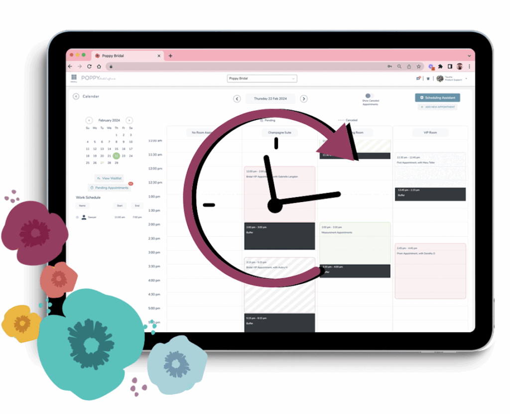 Let’s be real, Poppy’s all about making things easier for you as a bridal store owner—you’ve got enough going on. Using Poppy’s Scheduling Assistant is just one way to book appointments through Poppy, don’t worry we’ll break down the others later.