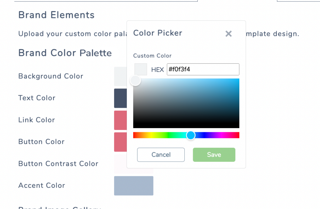 - To add your brand’s color to the Brand Color Palette, click the gray square with a + sign next to each email element.