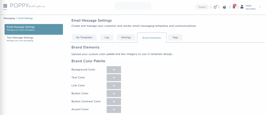 Setting up your bridal store’s branding elements in Poppy’s Messaging Center allows you to easily create or edit existing templates and make them customized for your store’s look and feel.