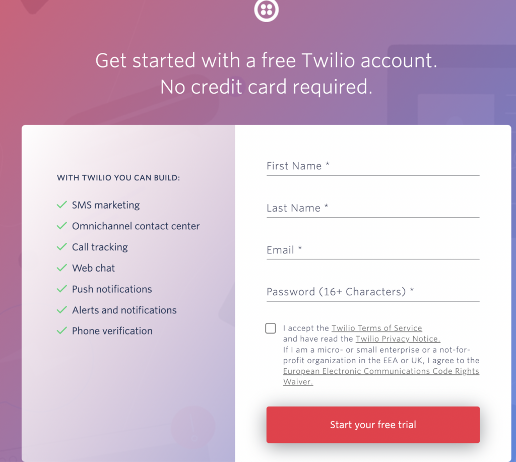 - Visit www.twillio.com and select the ‘Start For Free’ button in the top right corner of the navigation bar.