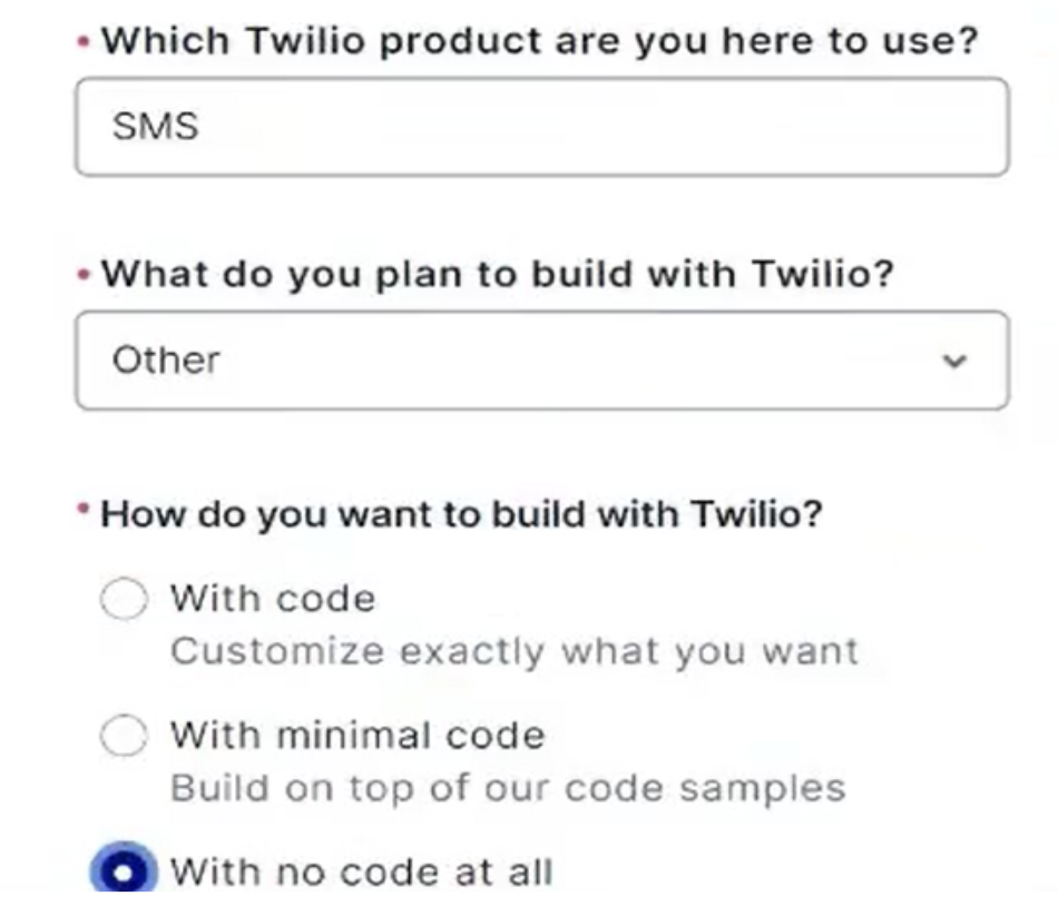 - Next, you’ll need to answer a few question for the Twilio user experience. Please follow the example shown below.