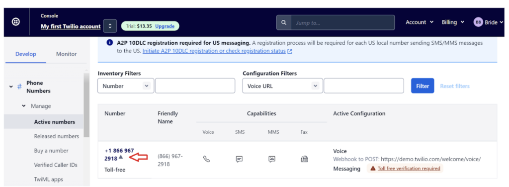 - Twilio Console > Phone Numbers> Manage > Active Numbers
