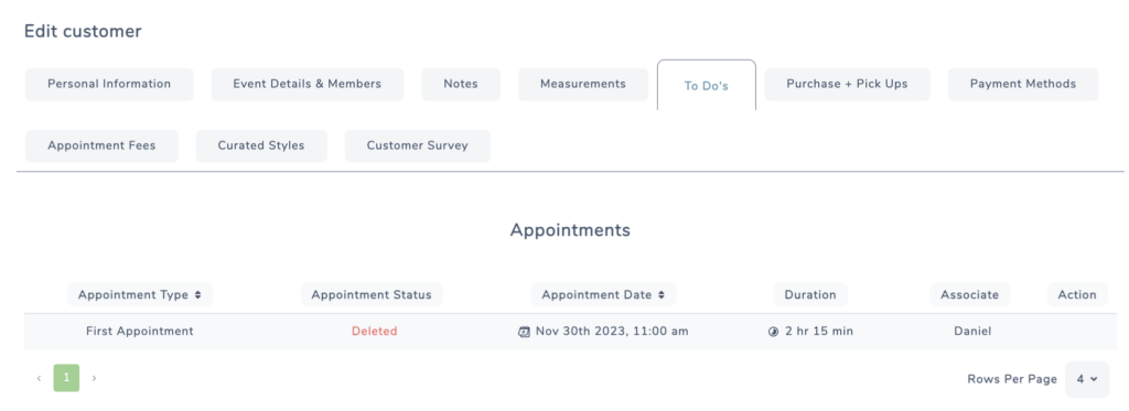 Here all Appointments will be listed for the customer. You are able to sort by appointment type or date for each appointment, under ‘Appointment status‘ you will be able to see which have been deleted.