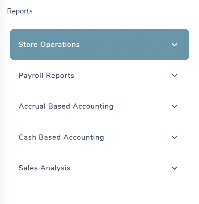 Use this section to see your store’s data organized within Store Operations, Payroll Reports, Accrual Based Accounting, Cash Based Accounting, and Sales Analysis.